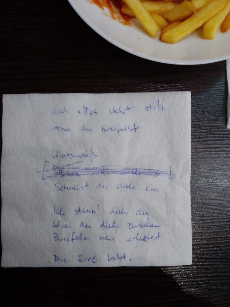 Zweifeln Und alles steht stillWenn du zweifelst WinterweißSchneist du dich ein Ich staun‘ dich anWie du dich zwischen ZweifelnNeu erhebst Die Erde bebt.